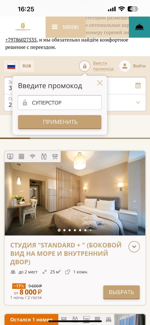 Для получения скидки перейдите на сайт Апартаменты Адмиральская лагуна и введите промокод - СУПЕРСТОР